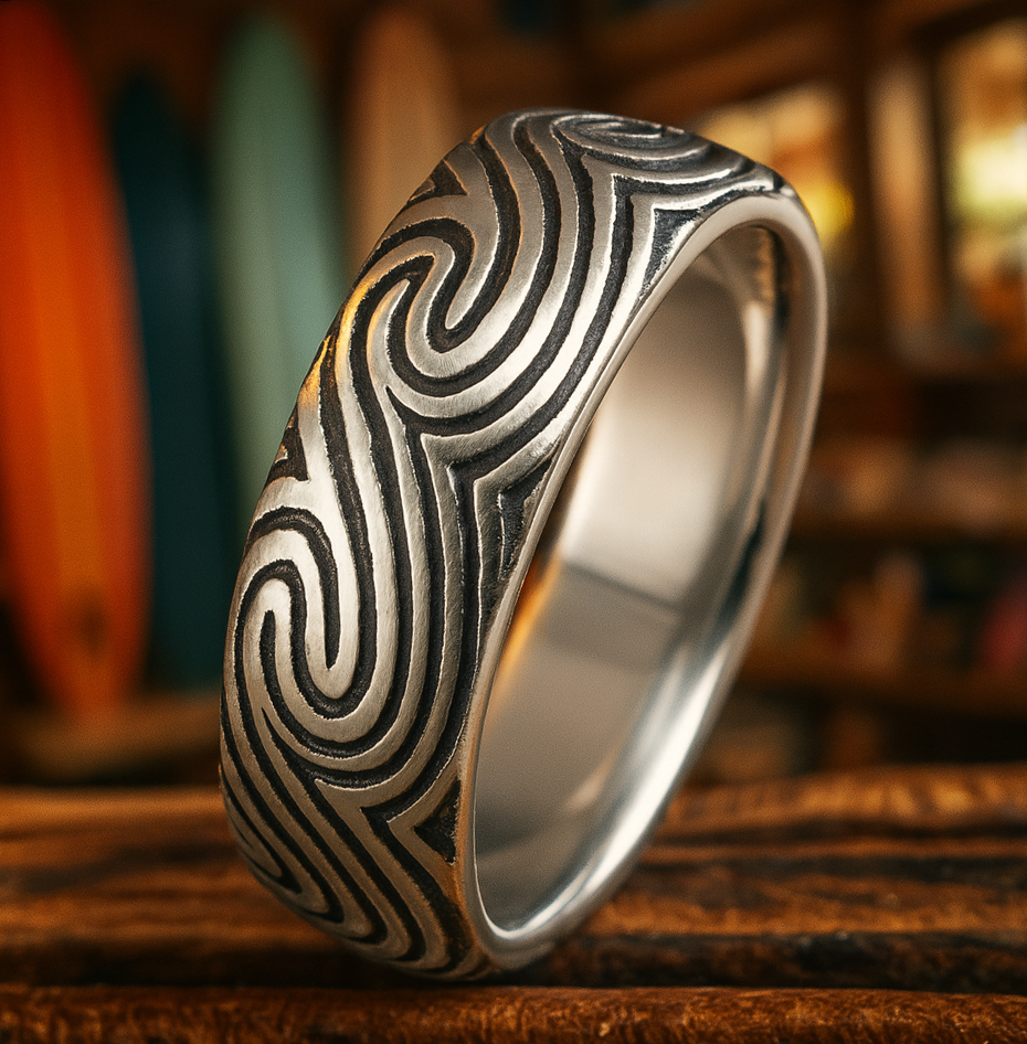 The Damasculaze™ Ocean pattern has a unique Damascus Steel look. The three dimensional texture makes it really stand out. The surface is composed of all aerospace grade titanium, so is very robust and hypoallergenic. The inside is made smooth for comfort and it is less reactive to the skin than white gold, steel, or silver would be. Can be anodized, polished, or brushed finish and the inside can be engraved with an inscription.