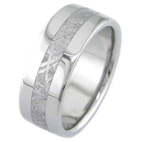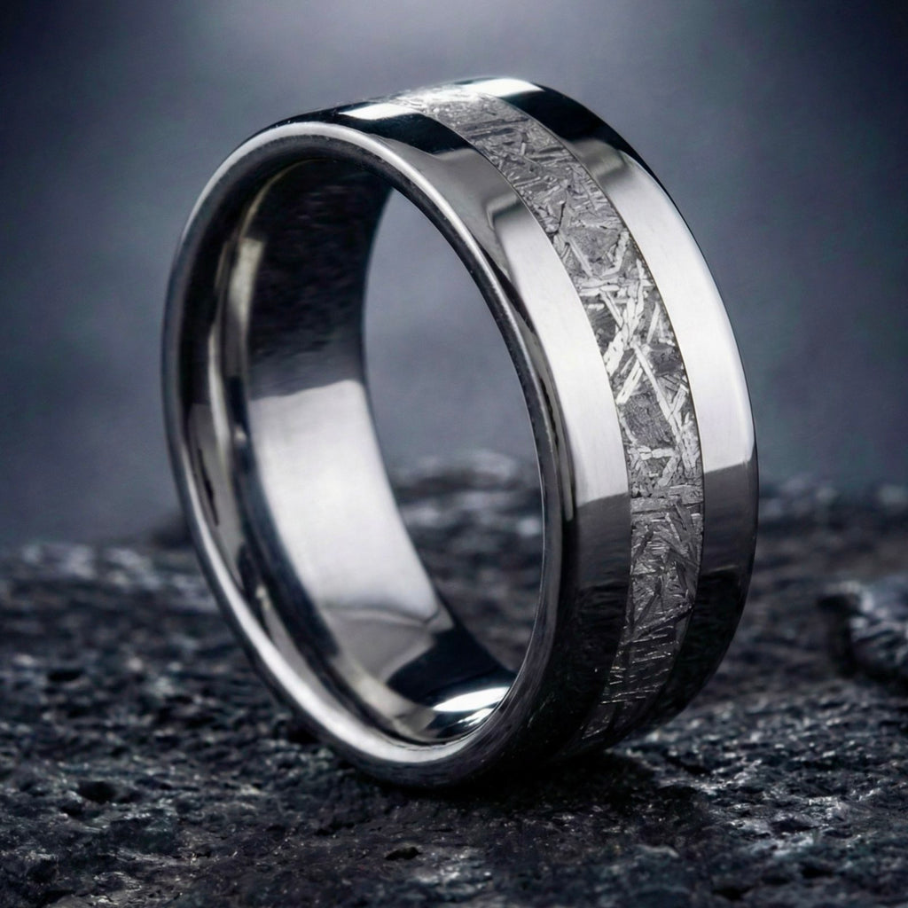The ring shown is a titanium ring with an inlay of genuine Gibeon Meteorite that fell to Earth in prehistory. The meteorite was discovered in Namibia in South Africa in 1838. It has a unique crystalline grain structure called Widmanstatten lines that were caused by the meteorite slowly cooling over millions of years as it hurtled through space. It is estimated to be about 4.6 billion years old, when the Earth had not yet fully formed! The government of Namibia has stopped export of the meteorite, so it will become rarer as the years go by. It's Space Age versus the Age of Space in perfect contrast. Nothing says Forever like something born from exploded star stuff.